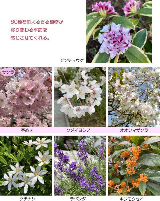 現在、研究所の庭には80種を超える香る植物があります。寒い冬の終わりを告げるジンチョウゲ、その後に続くサクラの開花が私たちの庭の花の季節の始まりです。新緑が美しい時期になる頃バラをはじめとした多くの花が咲き乱れ、庭は最も華やかになります。梅雨入りが近づくと、総合研究所のエントランスではクチナシやラベンダーが訪問者を出迎えます。暑い夏を越え涼しくなってくると、キンモクセイが秋の訪れを告げ、秋のバラが咲き終わる頃寒い冬を迎えます。会社に居ながらにして、季節ごとに移り変わる香りを感じることができます。