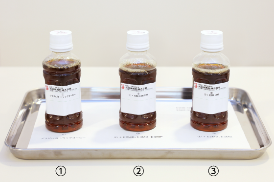 大橋 ご用意したのは3種類のコーヒーです。①はミディアムローストのブラジル産コーヒー豆をドリップして室温に冷ましたものです。②は、①にモカコーヒーから検出された3つのフルーティーな香り成分、ethyl 2-methylbutanoate(以下、E2MB)、ethyl 3-methylbutanoate(以下、E3MB)、E3MPを加えたものです。③は、②からE3MPを除いた比較品です。E2MBとE3MBは、コーヒーに含まれる既知の「フルーティー」な香り成分であり、先生の著作の中では、E3MB(日本語慣用名:イソ吉草酸エチル)はモカコーヒーの香りによく似ていると書かれていましたが、われわれが発見したE3MPと比較していかがでしょうか?